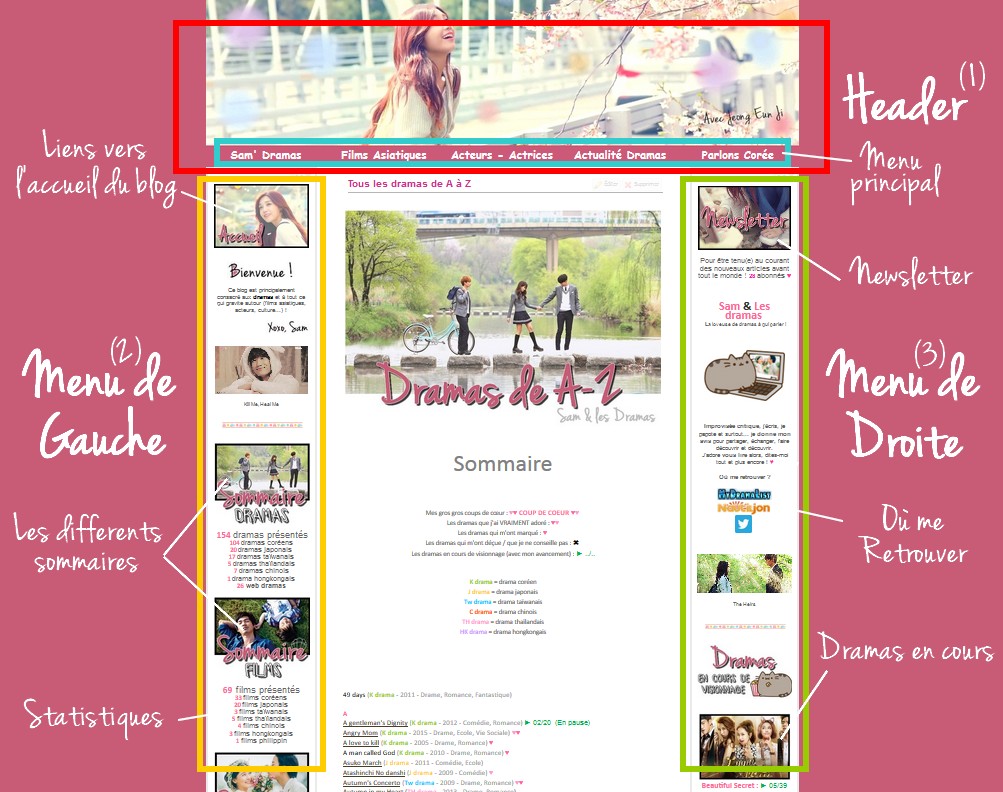 (3) Le menu de droite, quant à lui, est d’avantage centré sur « moi », à savoir les liens pour me retrouver, les dramas que je regarde en ce moment (avec mon avancement : Marriage Contract : ► 02/16), mes partenaires, ce que je vous conseille (films ou dramas) et les statistiques du blog (ces derniers ayant vocation à basculer sur le menu de gauche, mais je n’ai pas encore déterminé où)… En fait, vous pouvez cliquer à l’aveugle sur presque toutes les images des menus pour arriver vers un article ! :)