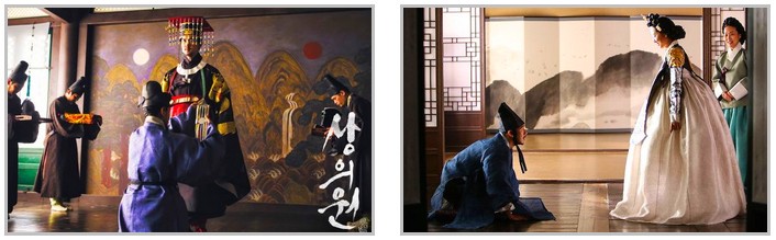 A ce propos je fais un petit point d’histoire, le hanbok (habit traditionnel coréen) à la particularité de refléter le statut social de son propriétaire, ainsi, plus celui-ci est riche, plus ses vêtements étaient colorés et décorés de broderies raffinées. A noter que la famille royale a ses propres motifs (comme le dragon). Le peuple lui, portait des hanbok non pas en soie mais en chanvre décoloré ou en coton et des couleurs discrètes comme le blanc, le rose clair, le gris, le vert clair etc. Bref, tout ça pour dire que, lorsque Kong Jin introduit dans la rue des hanbok aux couleurs flamboyantes, les conservateurs tremblent pour leur ordre politique.